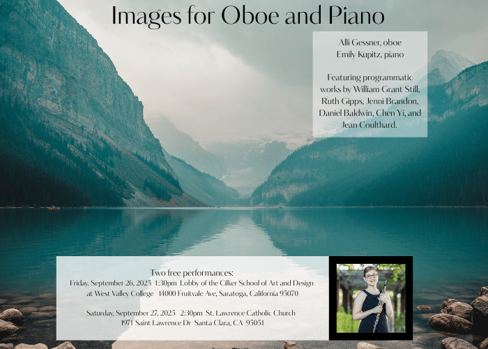 Hey Reader, You're invited to my free one-hour solo recital next week! Called Images for Oboe and Piano, each of the six pieces evokes a strong sense of place or character, from the mountains to the great plains to the seashore. This all-ages presentation includes music by traditionally under-represented composers William Grant Still, Ruth Gipps, Jenni Brandon, Daniel Baldwin, Chen Yi, and Jean Coulthard. There are two dates, and I hope you'll attend as well as spread the word: Friday,...